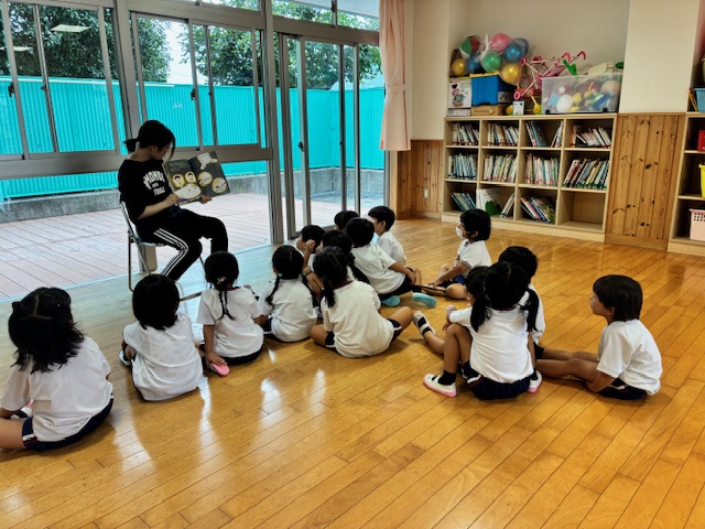 読み聞かせの時間が大好きな子どもたち。大好きな先生と一緒にお気に入りの絵本を選ぶのも楽しみのひとつです。