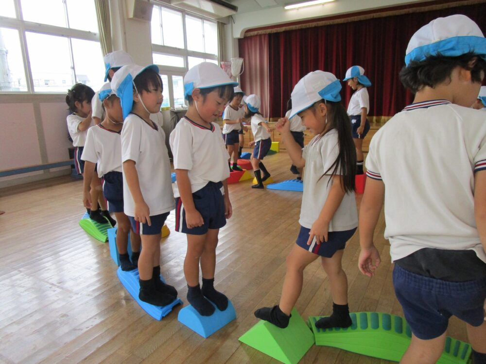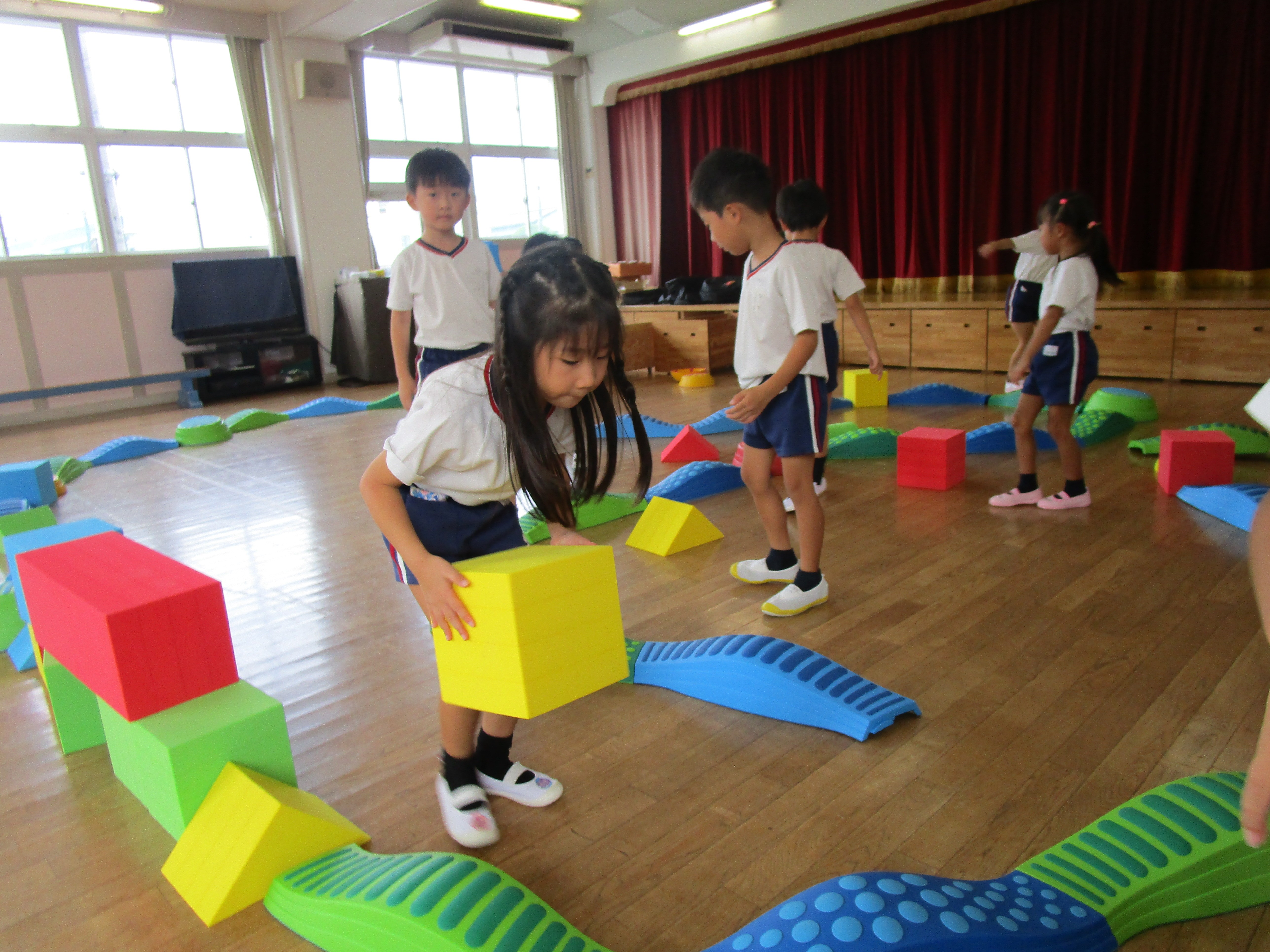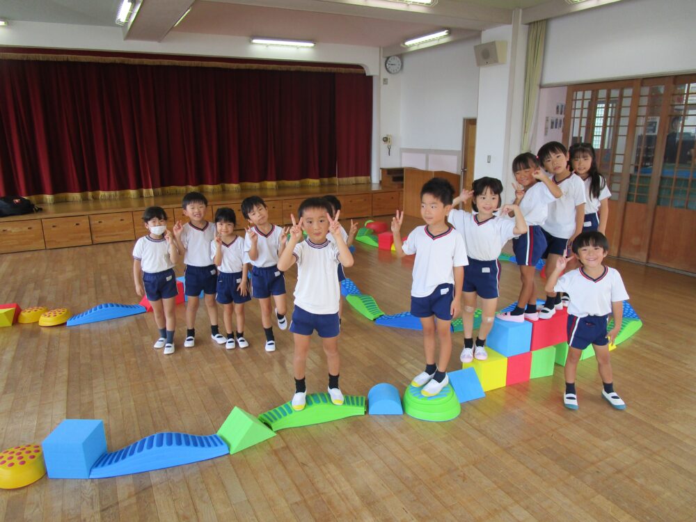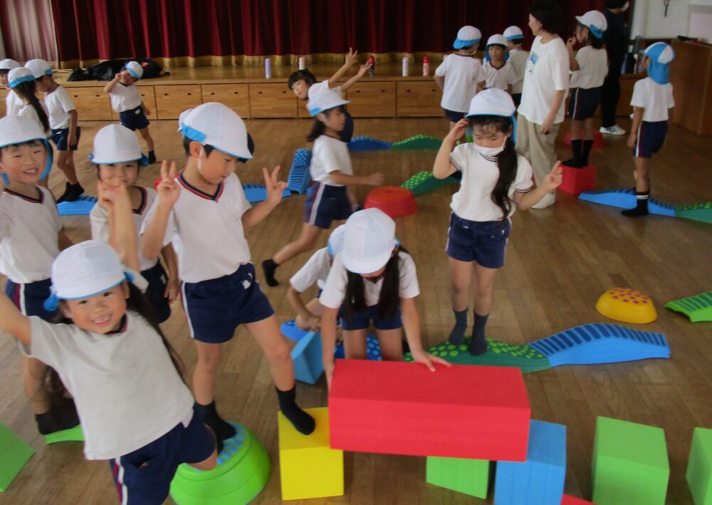 年長組さんありがとう 2025年9月19日 第二耕雲寺幼稚園 体育館にウェブバランスをセットしてくれました。その後他の学年のお友達も遊びました。年長組のお兄さんお姉さんが組み立ててくれたから遊べたよ、ありがとう~。