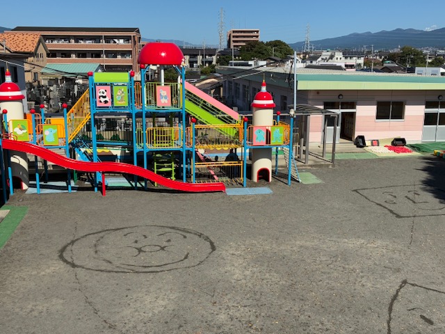 その後、りす組さんは「まる・さんかく・しかくゲーム」を楽しみました。グラウンドには、アンパンマンのキャラクターたちが登場!アンパンマンの『まる』、おにぎりまんの『さんかく』、しょくぱんまんの『しかく』、子どもたちに親しみのあるキャラクターを使いながら、形への興味を楽しく育むことができました。