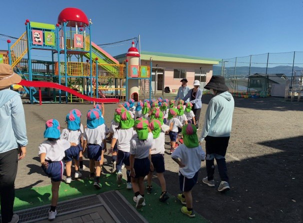 運動会の入場行進の練習を行った年少組さん。大きく手を振って、元気に歩く姿が見られました。行進の後は「うんとこどっこいうんどうかい」を歌います。楽しそうに歌う様子からも、運動会への期待が高まっているのが伝わってきました。