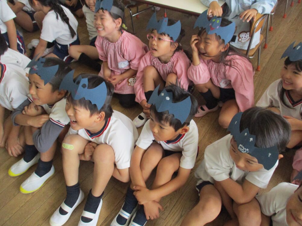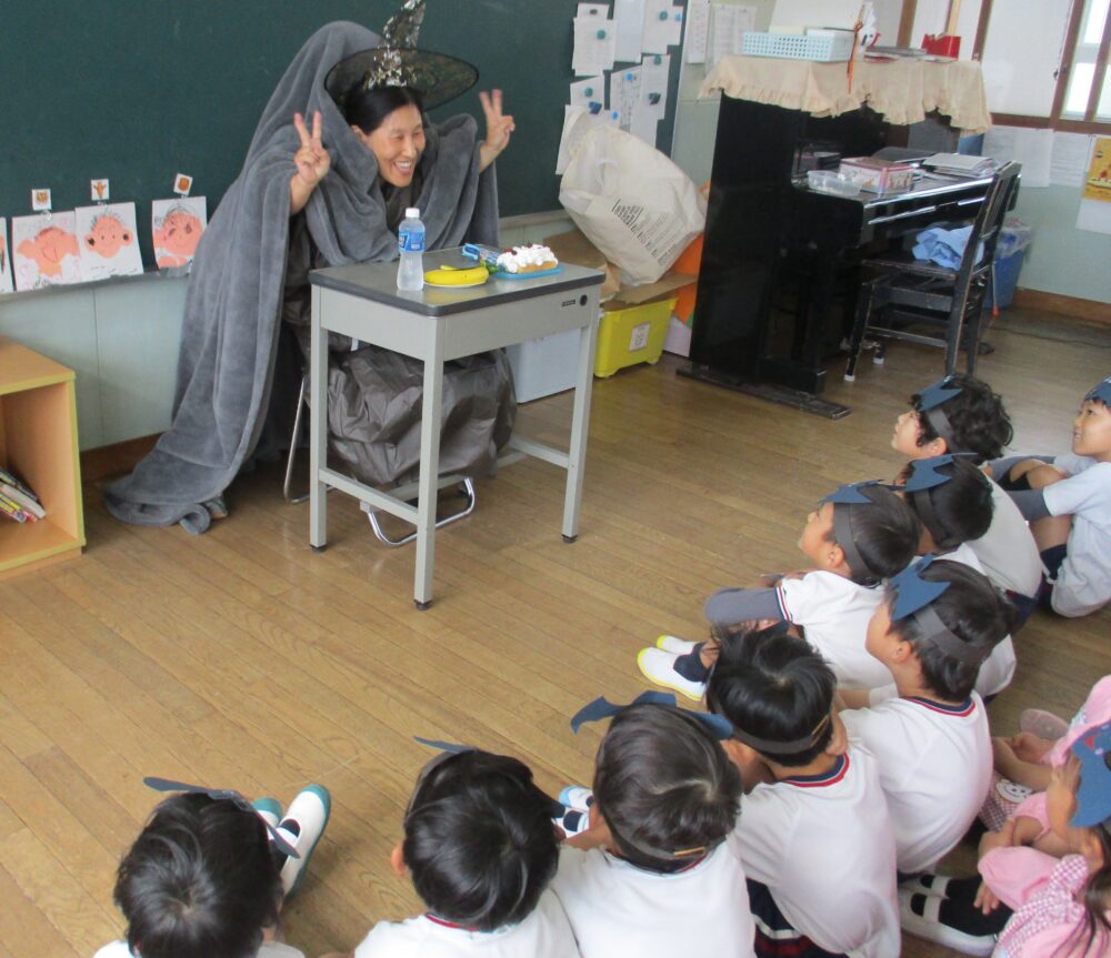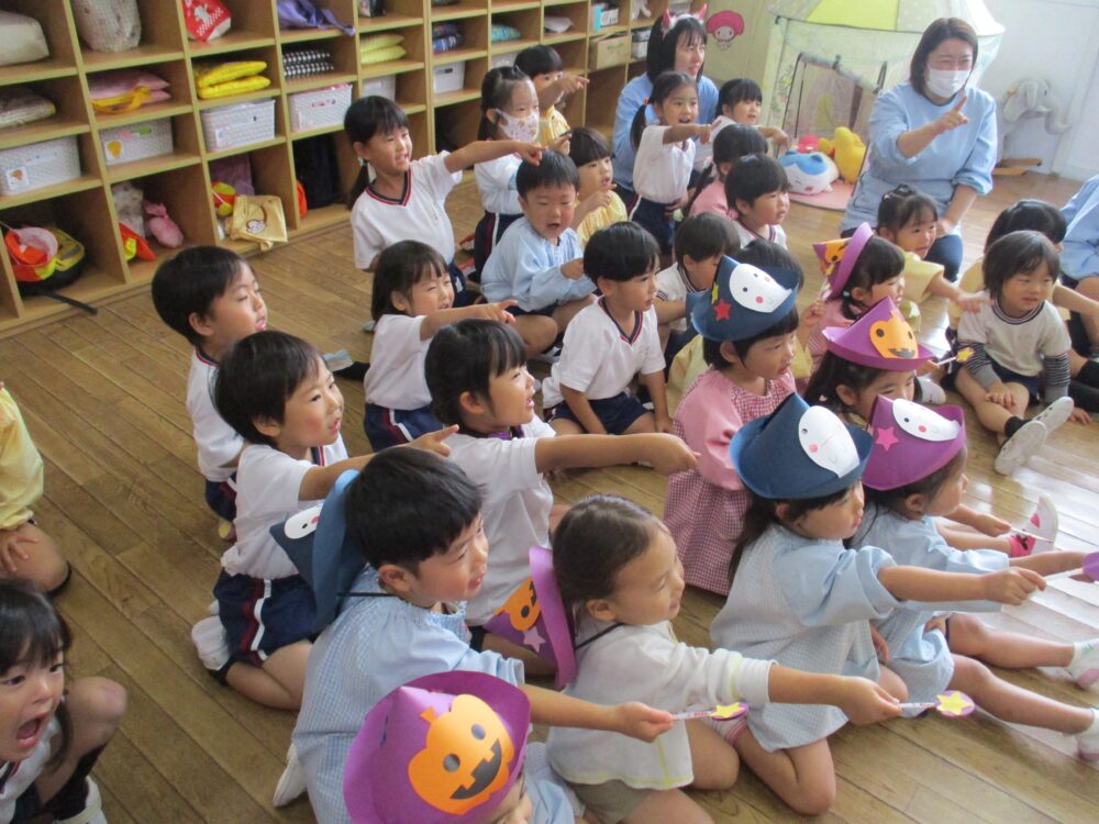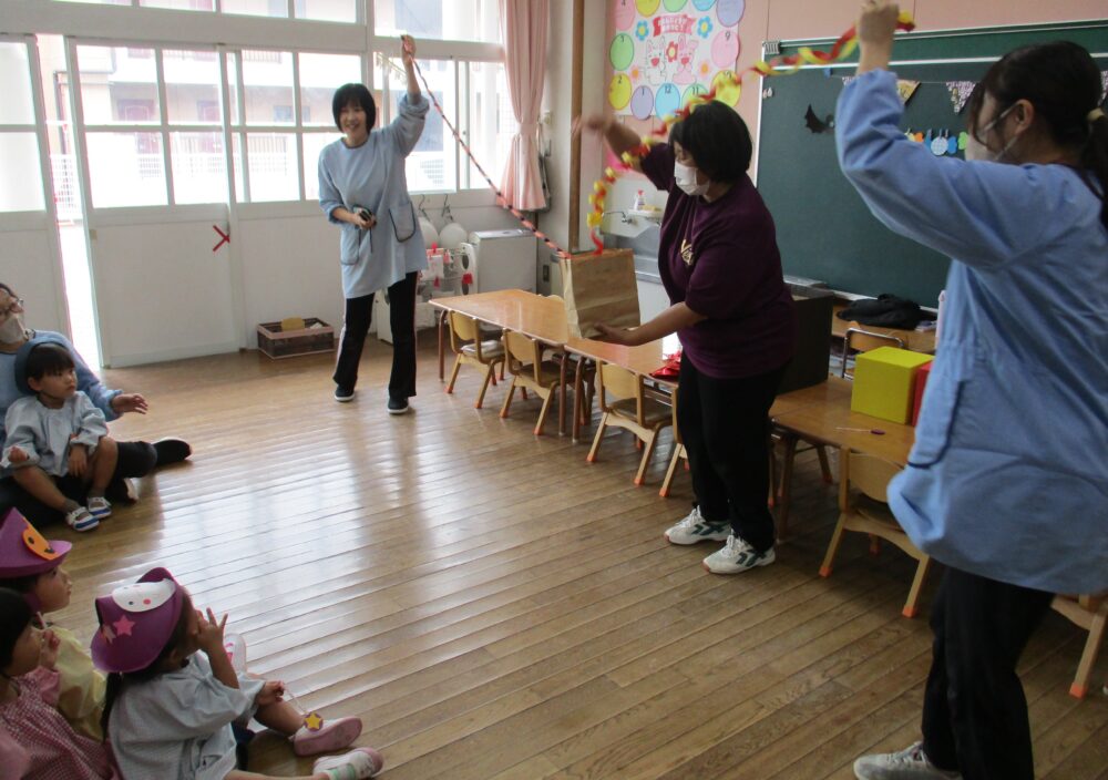 防犯訓練のあと、今日はサプライズで先生たちが楽しいことを準備していました。ハロウィンの日は第二耕雲寺幼稚園恒例、先生が教室で楽しいステージを披露します。去年はほうきに乗って空中を飛ぶ魔女さんが来てくれましたが、今年はまず二人組の怪しい人達が教室に入ってきました。固唾をのんで見守っていると、あれれ、二人が一人になっちゃった。