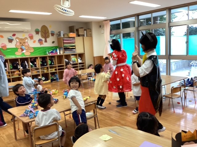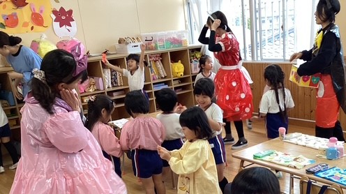 ハロウィンの日、先生たちがかわいい仮装をして、サプライズで各クラスをまわりました。突然の登場に子どもたちはびっくりしたり、笑ったりと大盛り上がりでした。先生たちからは、折り紙で作ったジャックオランタンのプレゼントも!みんなとっても嬉しそうに受け取っていました。