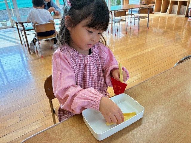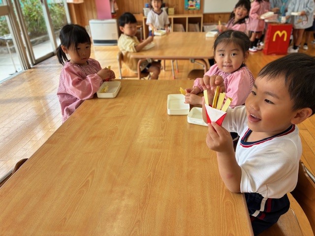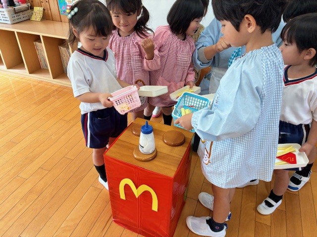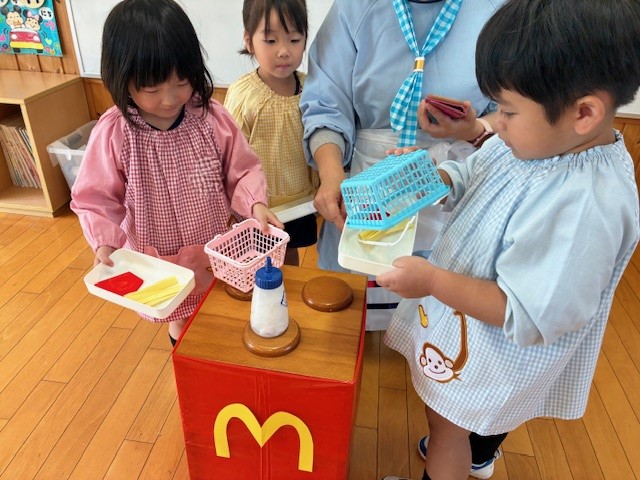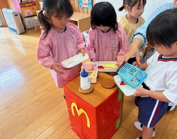 みんなでマクドナルドの店員さんになりきりました。ポテトはハサミでチョキチョキ切って、赤いカップは子どもたちが折り紙で作り、マークも上手に描きました。先生たちのアイデアで、ポテトを揚げる遊びも楽しみ、ポテトが揚がった時に鳴るタイマー音「ティロリサウンド」も流れ、より本格的に!憧れの店員さんになれてとても嬉しそうでした。
