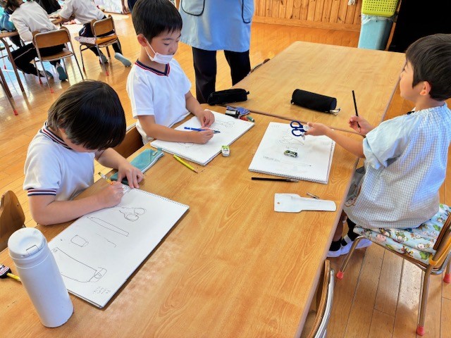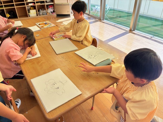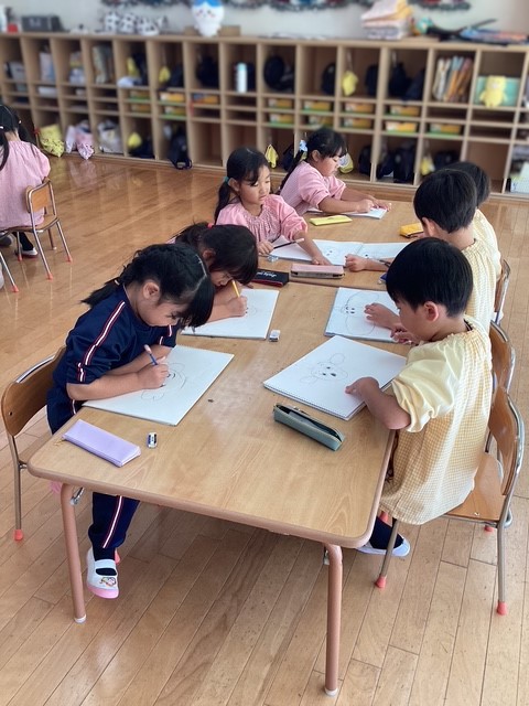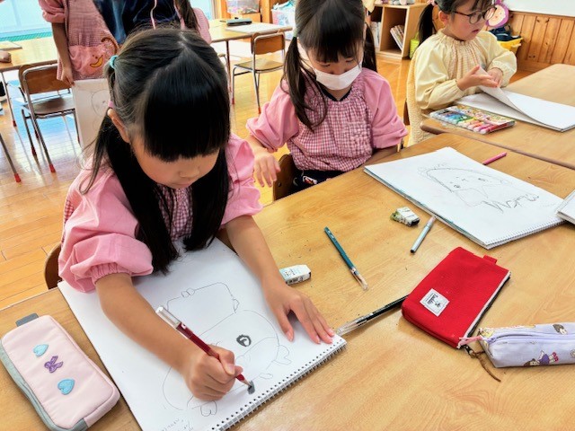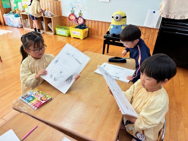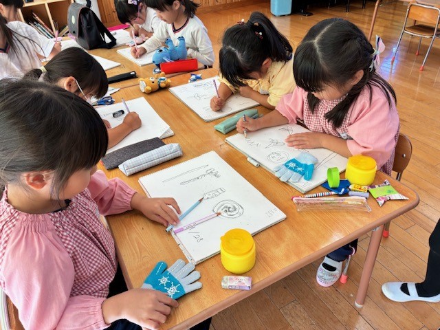 年長組さん模写に挑戦! 2025年12月2日 耕雲寺幼稚園 年長組 年長さんの模写の活動の様子を紹介します。ほし組さんはぬいぐるみを描きました。ふわふわの感触を手で確かめたり、じっくり観察したりしながら、特徴を見つけて丁寧に描いていました。 にじ組さんは、身の回りの持ち物を題材に模写をしました。上手に描けているお友だちの周りに自然と集まり、感心しながら見ている姿も見られました。お互いに刺激を受けながら、楽しんで取り組む様子が印象的でした。