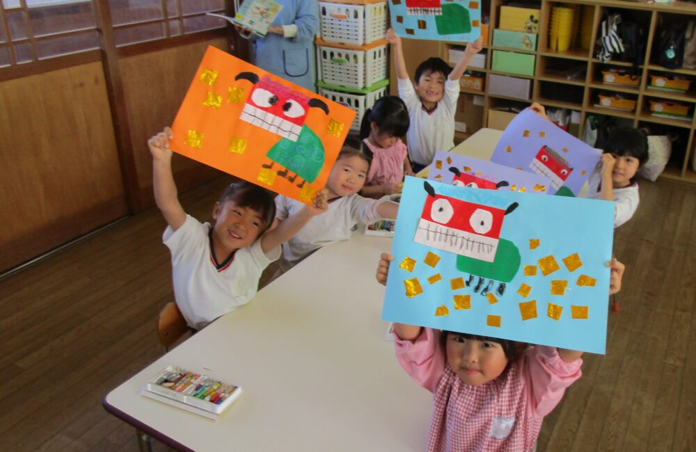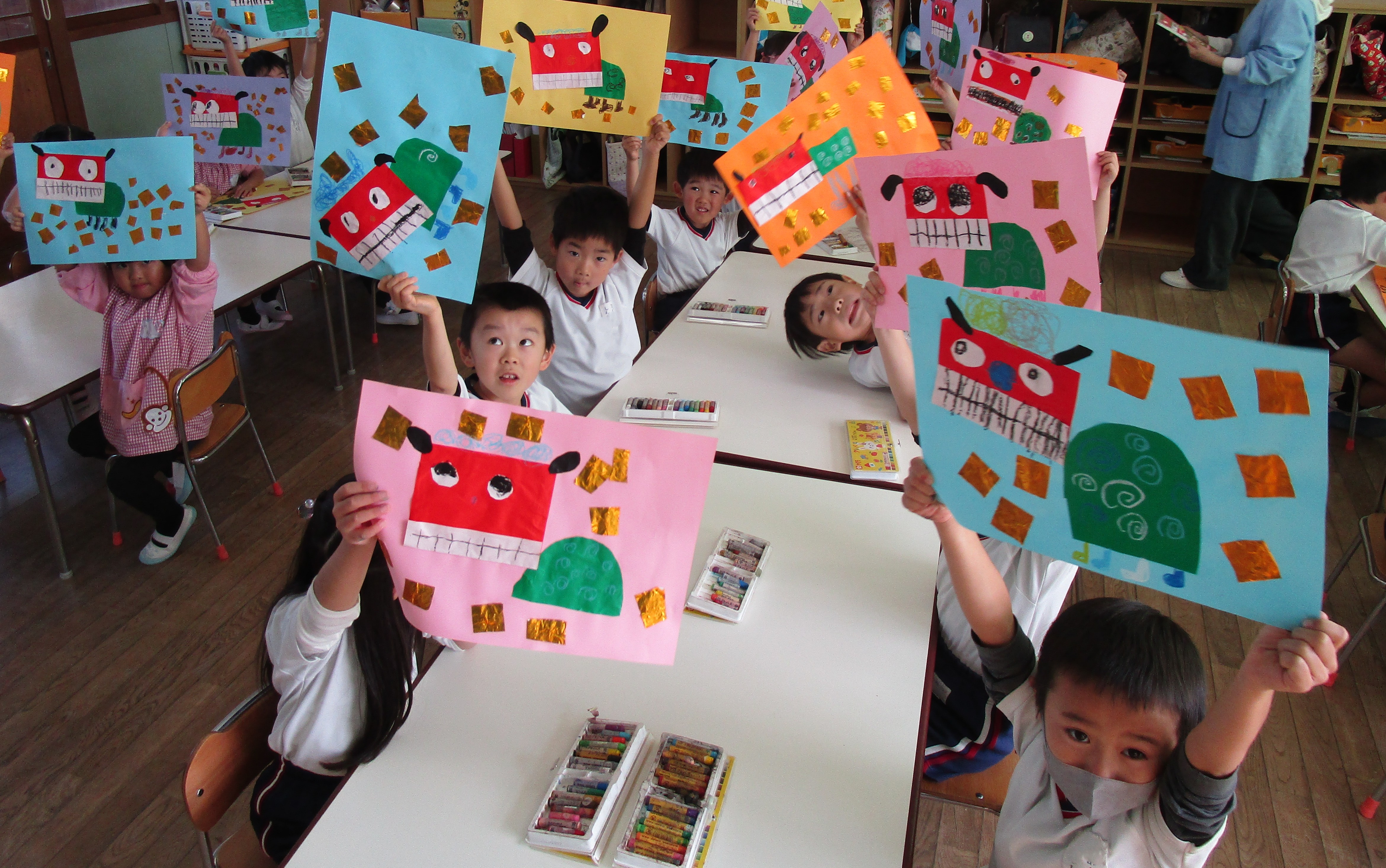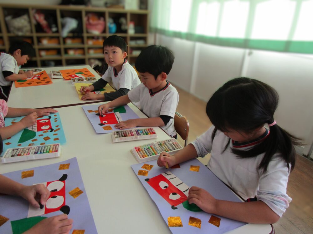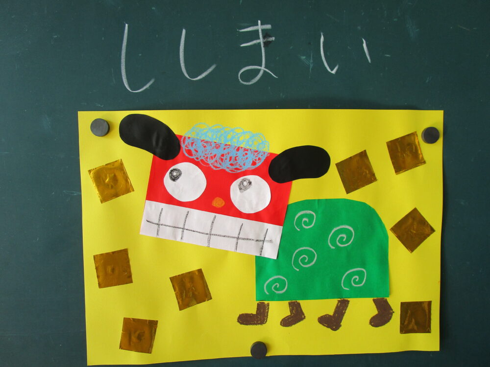 こちらは先生の見本です。ししまいを実際に見たことがある子は少ないです。この1枚の絵から想像力を働かせて自分の力で絵を完成させます。