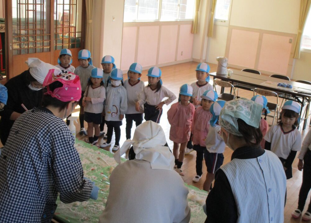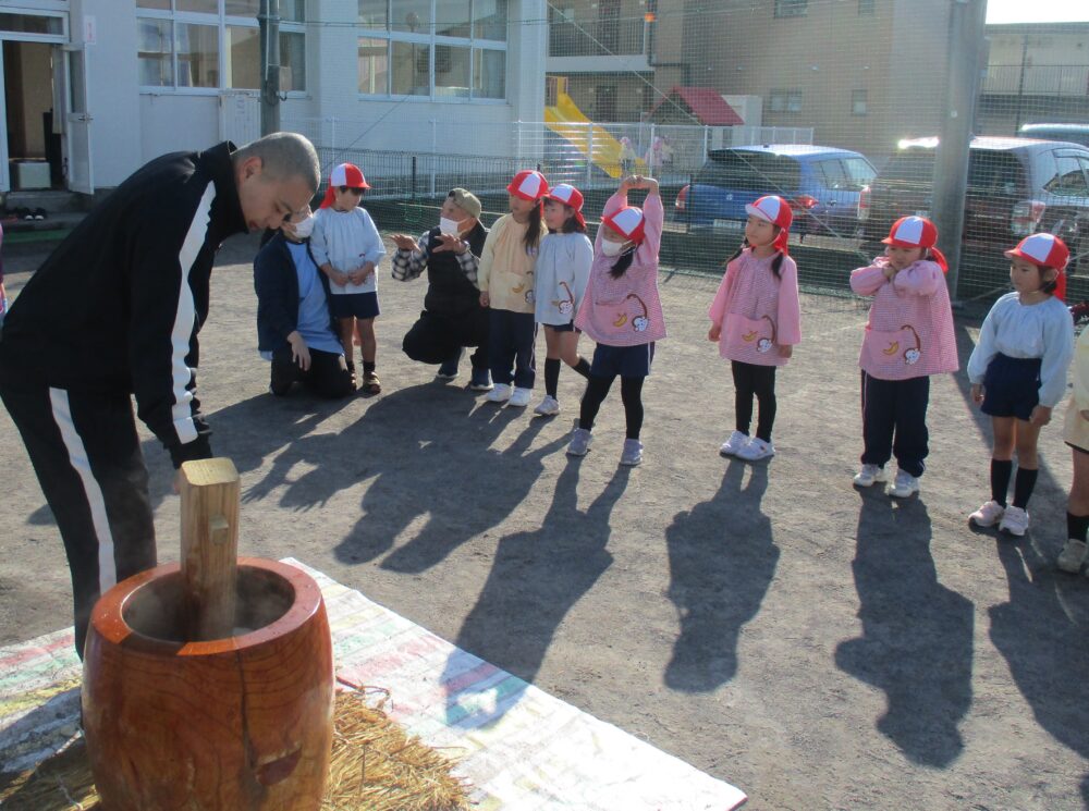 おもちつき 2025年12月19日 第二耕雲寺幼稚園 穏やかなお天気の中、おもちつきを行いました。ふかしたもち米がもちつきによりお餅になる過程や、柔らかいうちに食べることができるよう先生たちがきなこ餅やしょうゆ餅を作っているところを見ました。掛け声も響き、みんなクラスでお餅を食べましたね。