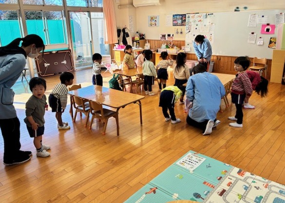 ちゅうりっぷ組さんに新しいお友だちが仲間入りしました 2026年1月13日 耕雲寺幼稚園 満三歳 今月、ちゅうりっぷ組に新しいお友だちが3人入りました。幼稚園が大好きなみんなと一緒に、毎日元気に楽しい時間を過ごしています。初めての幼稚園でご心配なこともあるかと思いますが、気になることがあればいつでもお気軽にご相談ください。安心して楽しく過ごせるようサポートしていきます。 朝のごあいさつ 名前を呼んで一人ひとり出席を確認します。 出席カードにシールを貼って、元気に一日のスタートです!今日もみんなで楽しい時間を過ごしましょう。
