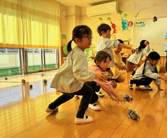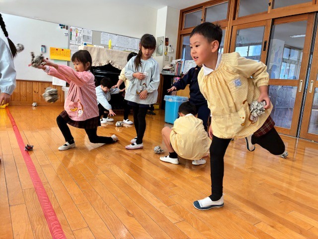 年末の活動にはなりますが、ほし組さんでは新聞紙を丸めて作ったボールを使い、相手の陣地に投げ合うゲームを行いました。実はこの新聞紙ボール、発表会で使う小道具の一部にもなっているようです。