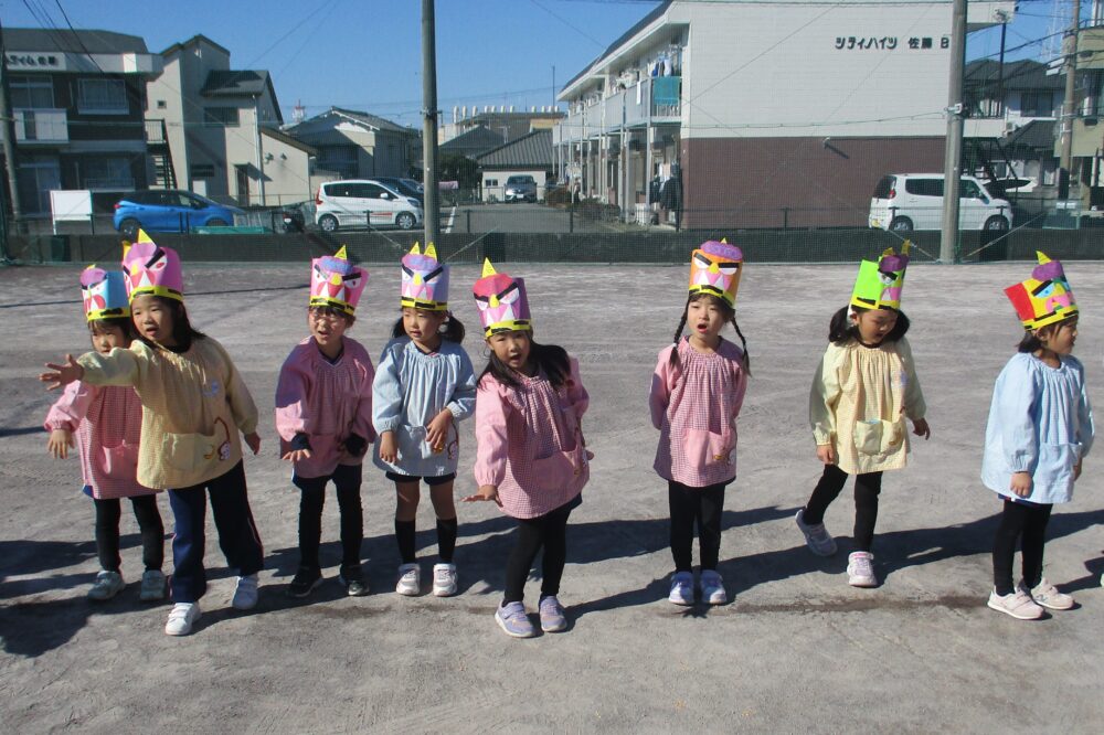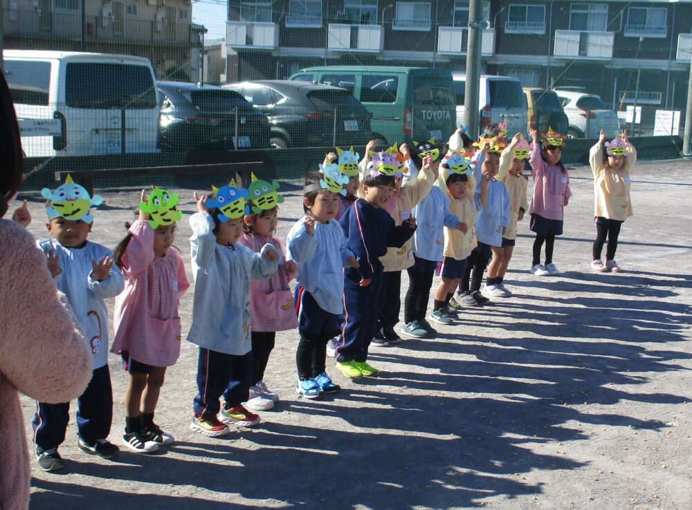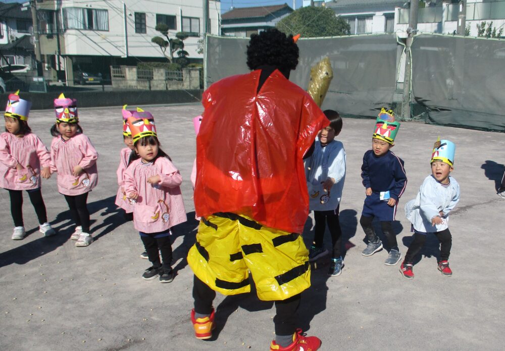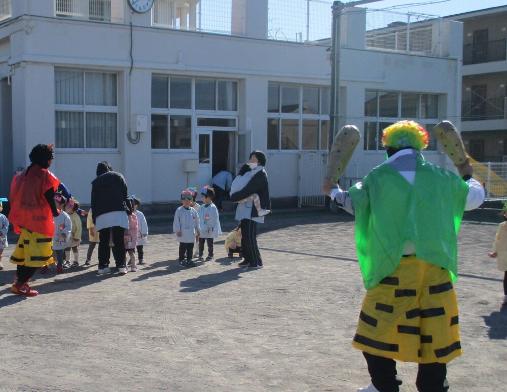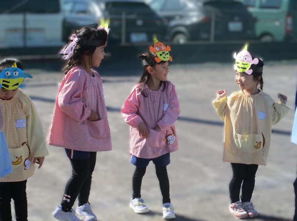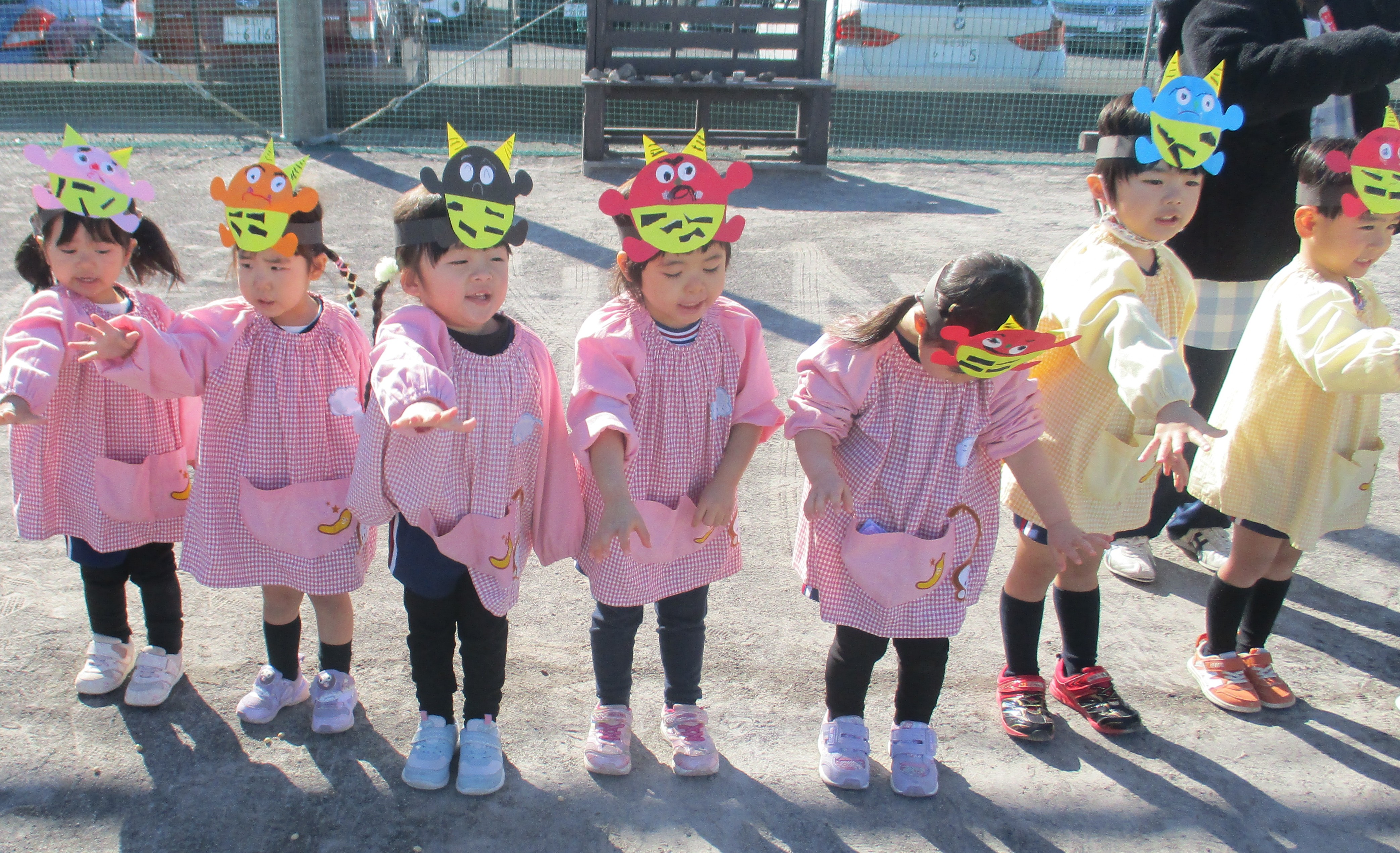 豆まきの会を全学年で行いました。鬼さんに投げる豆をあそび着のポッケに入れてさあ、準備はできています。年少組さんは初めての子が多いです。最初は豆を投げる練習もして余裕の表情ですね。年中組さんや年長組さんももちろん余裕です。